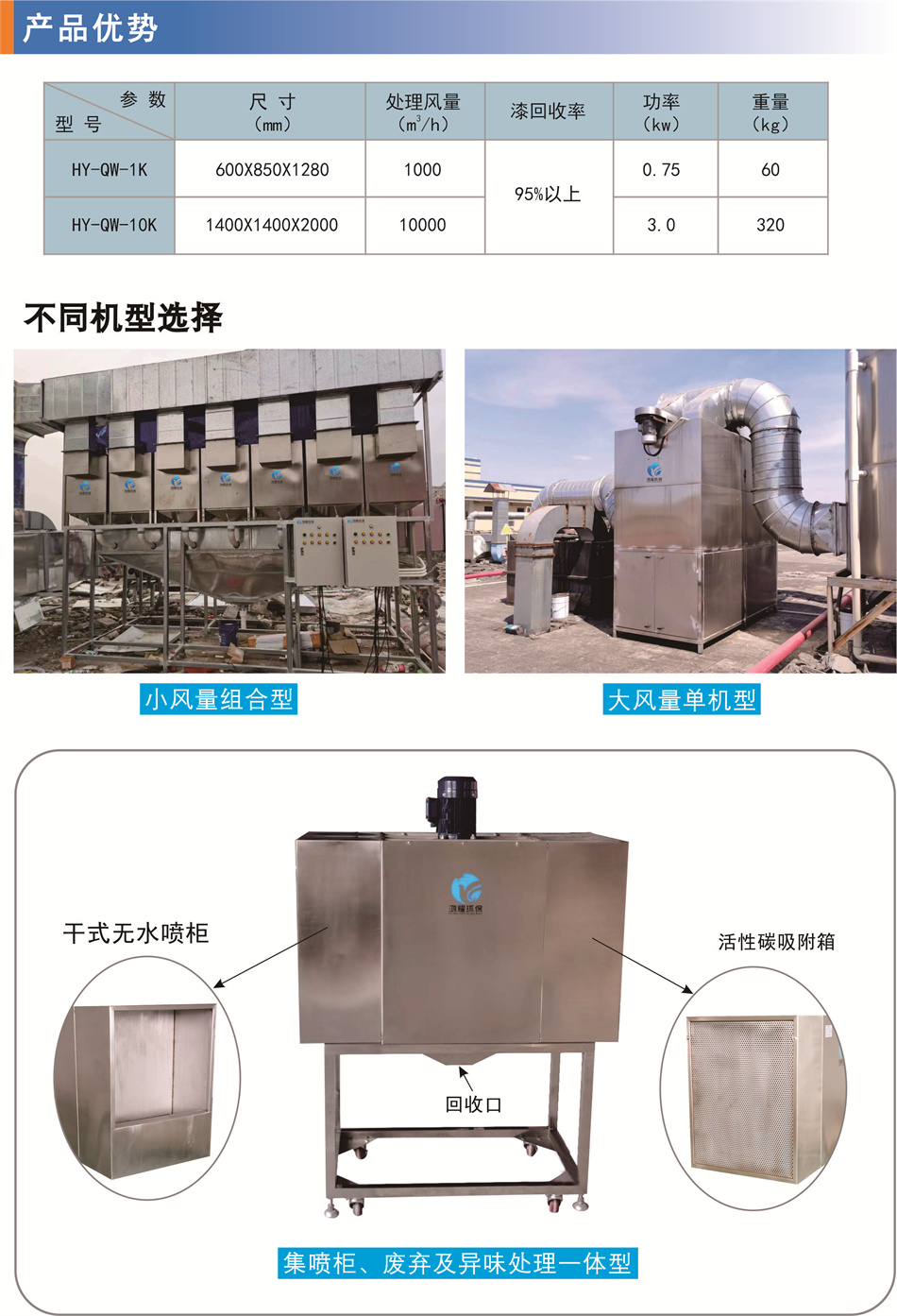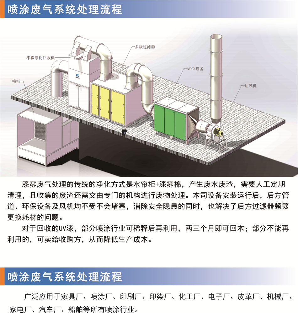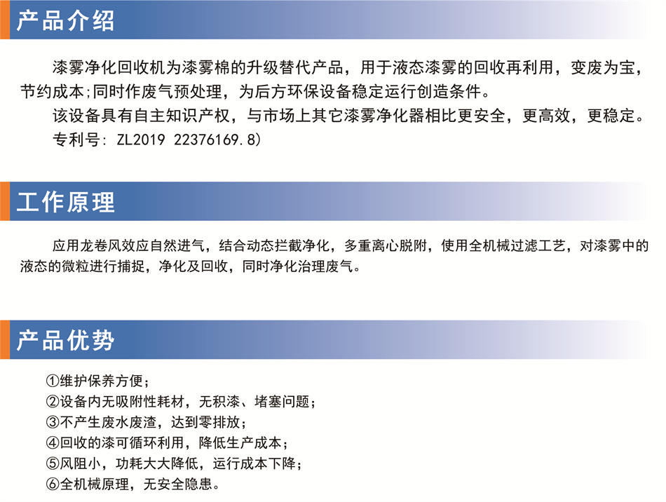 简要描述:漆雾净化回收机为漆雾棉的升级替代产品,用于液态漆雾的回收再利用,变废为宝,节约成本;同时作废气预处理,为后方环保设备稳定运行创造条件。该设备具有自主知识产权,与市场上其它漆雾净化器相比更安全,更高效,更稳定。 专利号:ZL201922376169.8)