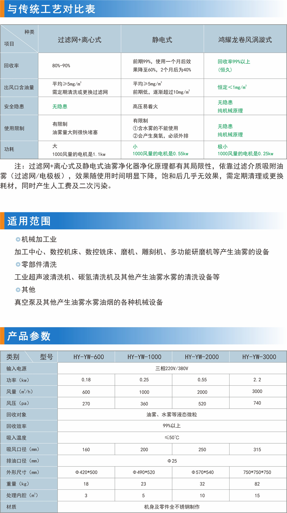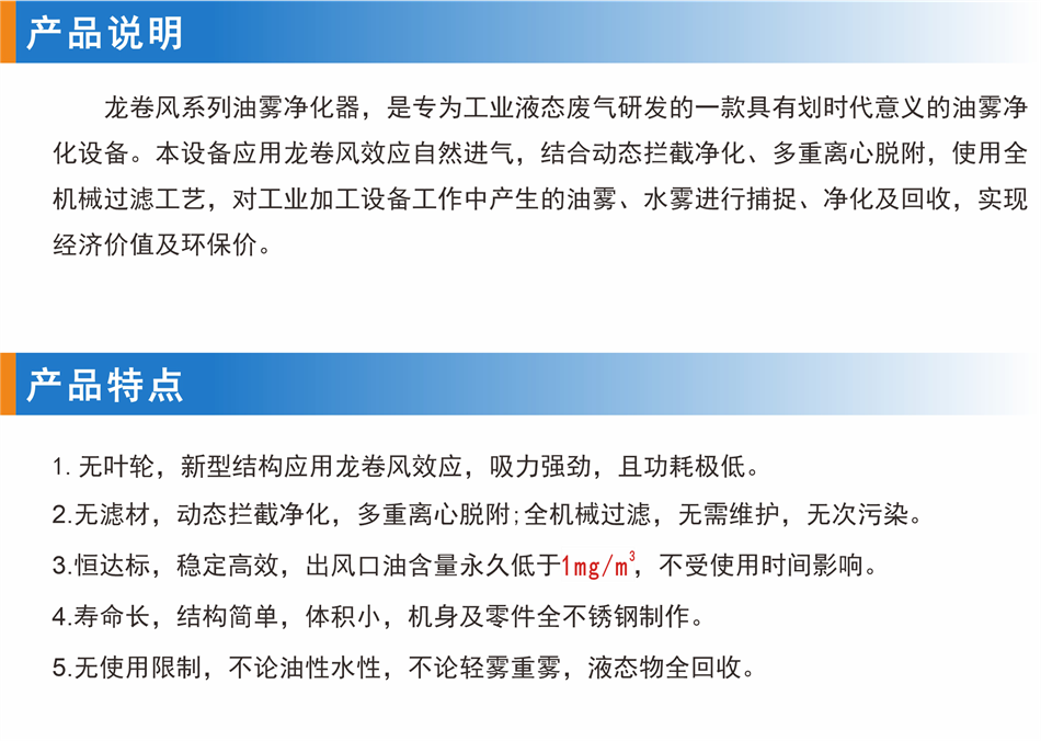 简要描述:龙卷风系列油雾净化器,是专为工业液态废气研发的一款具有划时代意义的油雾净化设备。本设备应用龙卷风效应自然进气,结合动态拦截净化、多重离心脱附,使用全机械过滤工艺,对工业加工设备工作中产生的油雾、水雾进行捕捉、净化及回收,实现经济价值及环保价。